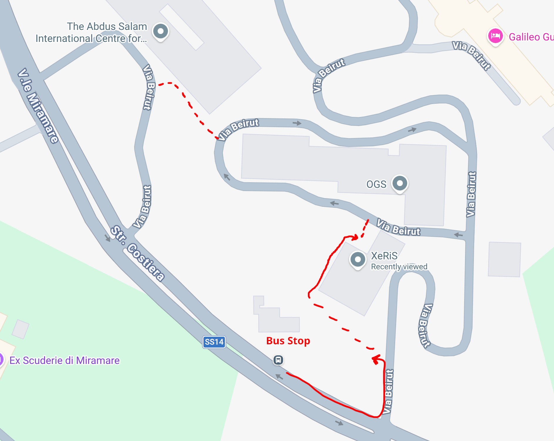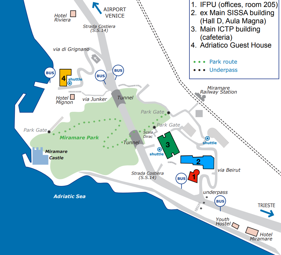 Arriving from Trieste: with bus 6, you can reach IFPU building (google maps) by going up Via Beirut, and immediately turning left through the parking garage (see also documents 1 & 2).